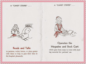 I was a candy striper, too. I remember feeling a little sick when I went into some of the rooms but mostly, I refilled water pitchers and pushed the cart of magazines around. It was a very cute outfit and we all looked cute. heehee! Sweet hugs, Diane